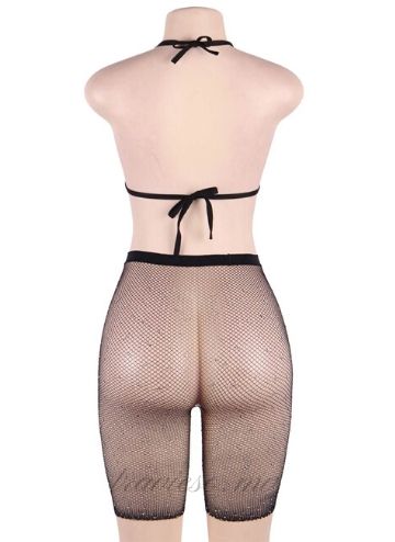 Black Fishnet Rhinestone Bikini Top and Shorts Set